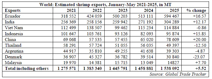 از ژانویه تا می ۲۰۲۵، صادرات میگو از بیشتر منابع افزایش یافته است. در کشورهای تولیدکننده جنوب شرق آسیا، تقاضای داخلی برای میگو نیز در قیمتهای جذاب پایدار مانده است.