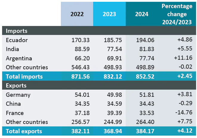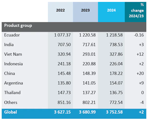 صادرات: در سال ۲۰۲۴، اکوادور، هند، ویتنام، اندونزی و چین از نظر حجم پیشتاز صادرکنندگان بودند. با این حال، از نظر ارزش، چین در جایگاه چهارم قرار داشت (۲.۱۶ میلیارد دلار).
