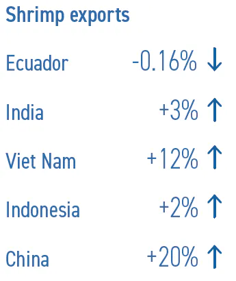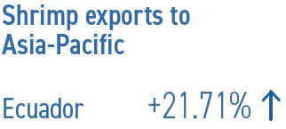 اکوادور بزرگترین صادرکننده میگو به منطقه آسیا-پاسفیک در سال ۲۰۲۴ بود و ۵۷,۰۰۰ تن میگو (۲۱.۷۱+ درصد نسبت به سال قبل) به ۱۵ بازار در این منطقه صادر کرد. ژاپن و استان تایوان چین مقاصد اصلی بودند. در بنگلادش، تایلند و ویتنام، تقاضای داخلی قوی و قیمت بالای میگوی آب شیرین Macrobrachium rosenbergii باعث کاهش تجارت صادرات شد.