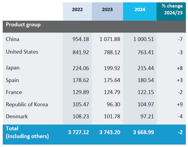 برترین بازارها از نظر ارزش، ایالات متحده (۶.۳۳ میلیارد دلار)، چین (۵.۰۶ میلیارد دلار) و ژاپن (۱.۹۲ میلیارد دلار) بودند. با این حال، چین از نظر حجم واردات در رتبه اول قرار داشت.