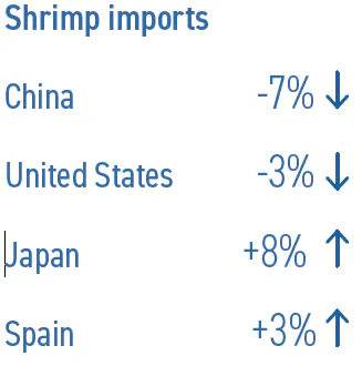 در دوره ژانویه تا مارس ۲۰۲۵، واردات میگوی چین نسبت به سال قبل ۱۱.۵۵ درصد کاهش یافت و به ۲۲۲,۲۱۵ تن رسید، اما در ایالات متحده افزایش داشت (۲.۶۳+ درصد و به ۲۰۵,۸۳۸ تن). واردات در ژاپن نیز در مقایسه با همان دوره در سال ۲۰۲۴ کمی کاهش داشت (۰.۳۷- درصد) و به ۴۴,۹۵۱ تن رسید.