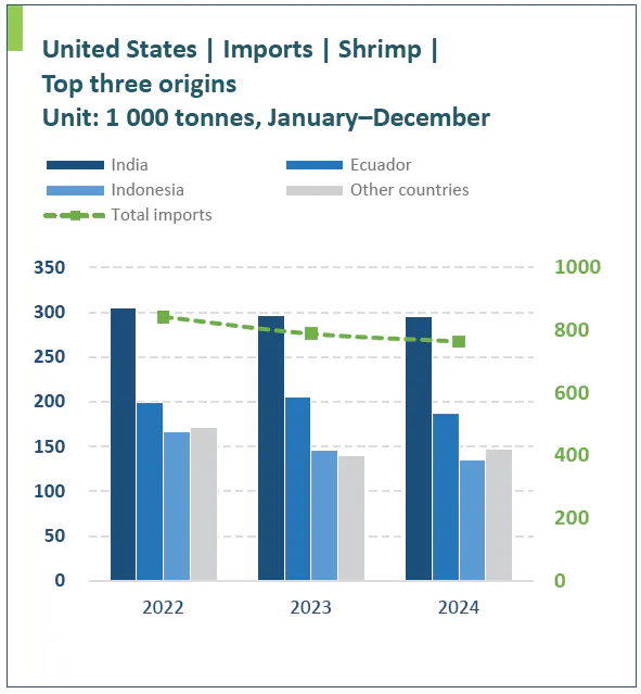 در سال ۲۰۲۴ طبق دادههای منتشرشده بازار ۷۶۲,۸۰۴ تن میگو به ارزش ۶,۰۶۶ میلیون دلار وارد کرد که نسبت به سال قبل کاهش ۳.۲ درصدی در حجم و ۵.۸ درصدی در ارزش را نشان میدهد و ۱۵ درصد کمتر از اوج سال ۲۰۲۱ است. از میان پنج تأمینکننده اصلی هند، اکوادور، اندونزی، ویتنام و تایلند، همه به جز ویتنام کاهش سالانه صادرات به بازار آمریکا را تجربه کردند.