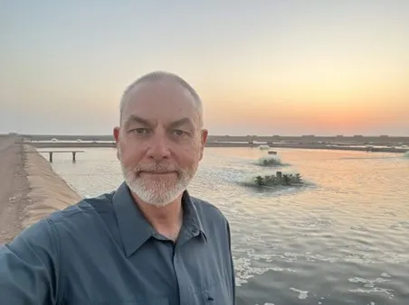 Andrew Campbell، مدیرعامل AQ1، در یک مزرعه پرورش میگو در خاورمیانه.