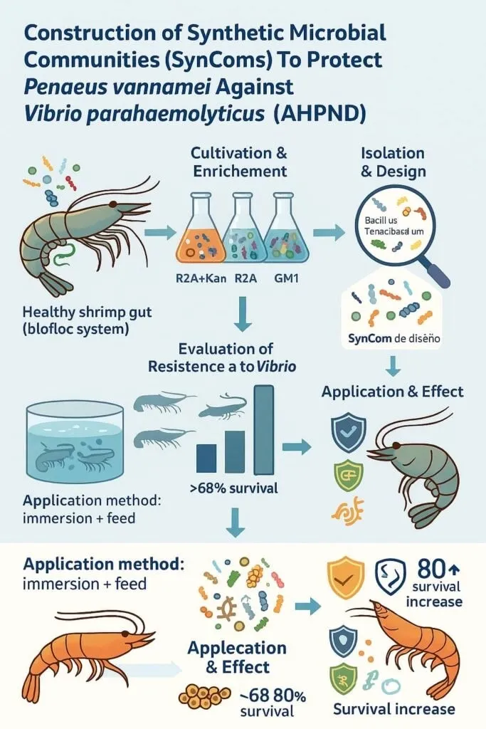 - جوامع سنتزی تازه ایجاد شده (SynComs) ، بهویژه SynComAll (۸ سویه) و SynComR2A+Kan (۶ سویه)، بقای میگوها پس از چالش با Vibrio را تا ۶۸.۱٪ افزایش دادند.