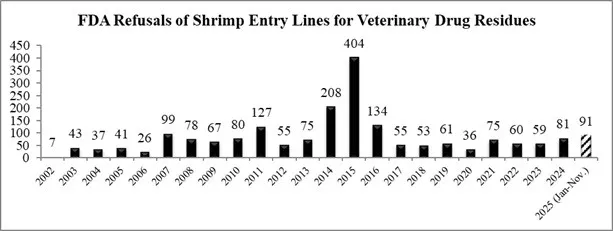 براساس گزارش FDA، تا نوامبر ۲۰۲۵، در مجموع ۹۱ مورد ورود میگو به دلیل باقی‌مانده داروهای دامپزشکی رد شده است. همان‌طور که در نمودار زیر نشان داده شده، این ششمین رتبه بالاترین تعداد رد ورود میگو به دلیل باقی‌مانده داروهای دامپزشکی در ۲۴ سال گذشته است و بالاترین میزان رد در یک سال توسط FDA از سال ۲۰۱۶ محسوب می‌شود.