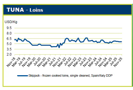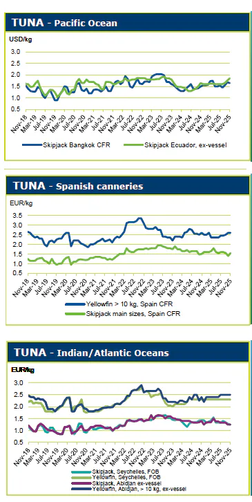 واردات تمامی محصولات ماهی تون به اتحادیه اروپا (EU) در نیمه نخست سال ۲۰۲۵ به‌طور چشمگیری افزایش یافت و به ۵۶۷٬۲۰۰ تن رسید، در حالی که این رقم در مدت مشابه سال ۲۰۲۴ برابر با ۵۰۶٬۰۰۰ تن بود. این افزایش عمدتاً ناشی از رشد صادرات ماهی تون اکوادور بود که در نیمه نخست سال ۲۰۲۵ نسبت به مدت مشابه سال ۲۰۲۴، ۲۸ درصد یا نزدیک به ۳۰٬۰۰۰ تن افزایش یافت.