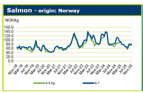 داده‌های NSC که از طریق پورتال قیمتی Undercurrent News منتشر شده‌اند، نشان می‌دهند که قیمت سالمون تازه کامل نروژی (HOG)، به‌صورت FOB در مرز، در هفته ۴۴ به ۸۱٫۲۶ کرون نروژ (۶٫۹۵ یورو) به ازای هر کیلوگرم رسید که نشان‌دهنده افزایش ۳٫۶۷ درصدی نسبت به هفته قبل است. این دومین هفته متوالی بهبود قیمت پس از سه هفته کاهش ملایم بین هفته‌های ۴۰ تا ۴۲ به شمار می‌رود. با وجود نوسانات کوتاه‌مدت، قیمت‌ها از اواخر سپتامبر نسبتاً باثبات باقی مانده و در حدود ۸۰ کرون نروژ به ازای هر کیلوگرم حفظ شده‌اند که حاکی از تقاضای قوی و شرایط متعادل عرضه در بازارهای کلیدی است.