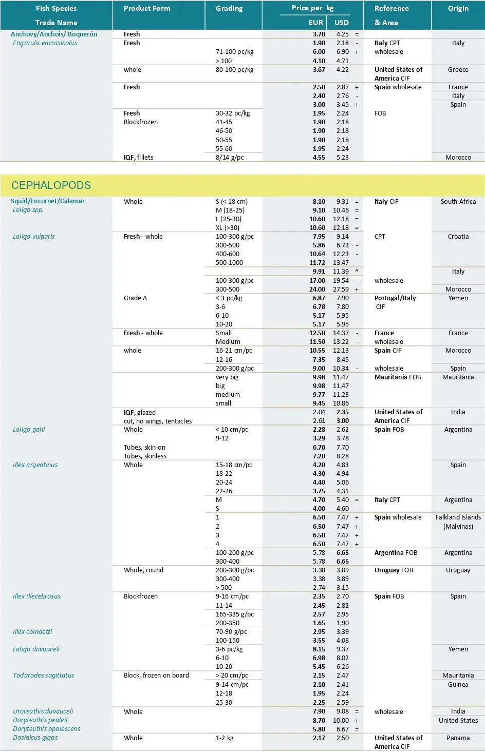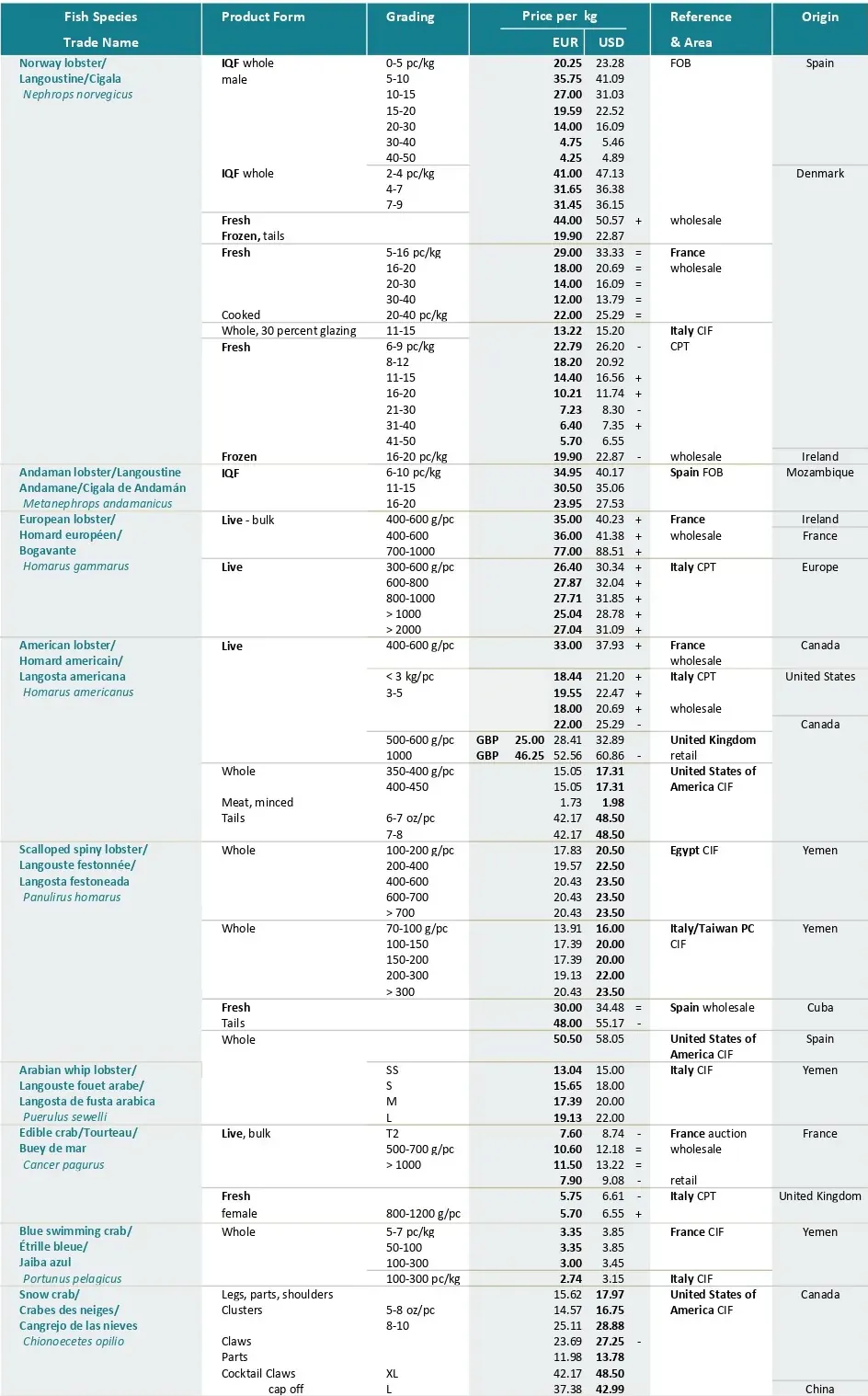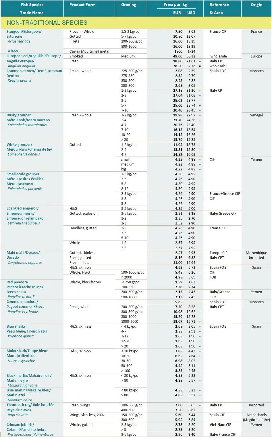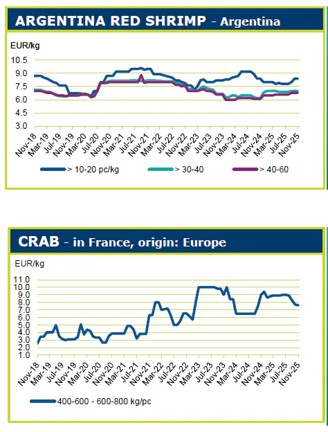 تجارت در آستانه کریسمس با افزایش تقاضا و سطوح قیمتی بالاتر برای برخی محصولات کلاسیک جشن‌ها مانند لابستر و صدف خوراکی همراه است. با وجود این روند عموماً مثبت، عدم قطعیت همچنان حاکم است. در حالی که معمولاً قیمت محصولات در این مقطع از سال افزایش می‌یابد، در ماه نوامبر تعدادی از آن ها ۲۰ درصد افزایش قیمت داشتند ، ۱۹ درصد کاهش یافتند و قیمت ۶۱ درصد از آن ها ثابت باقی ماند. افزون بر این، برخی از سطوح قیمتی که گونه‌های ماهیان کف‌زی در طول سال به آن رسیده‌اند، بیش از حد گران تلقی می‌شوند و بازرگانان به دنبال جایگزین‌های کم‌هزینه‌تر هستند.