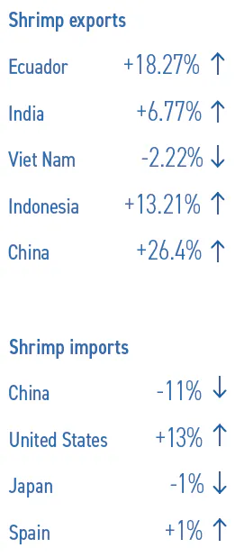 روند عرضه از اکوادور به چین، که بزرگترین بازار میگوی اکوادور محسوب میشود، نهتنها مسیر نزولی پیشین خود را معکوس کرد، بلکه همزمان بازگشت قدرتمندی را نیز نشان داد. همچنین صادرات اکوادور به ایالات متحده آمریکا، اسپانیا، فرانسه و ایتالیا در این بازه افزایش یافت.