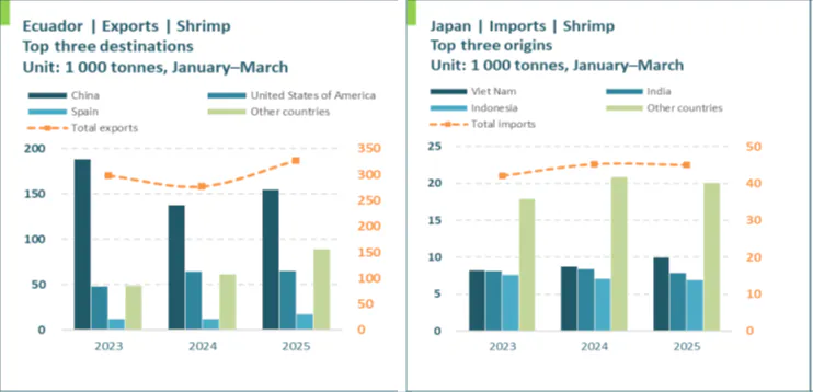 در سهماهه اول سال ۲۰۲۵، واردات میگو در چین نسبت به سال قبل ۱۱.۵۵ درصد کاهش یافت و به ۲۲۲٬۲۱۵ تن رسید. در دوره ژانویه تا ژوئن ۲۰۲۵ نیز همین روند نزولی ادامه داشت و واردات با کاهش ۲.۸۹ درصدی نسبت به مدت مشابه سال ۲۰۲۴ به ۴۶۹٬۵۹۶ تن رسید. این دوره ششماهه با کاهش خرید میگوی وانامی همراه بود، بهویژه از اکوادور، هند و تایلند. همزمان، واردات میگوی آبهای سرد از کانادا، آرژانتین، نروژ و گرینلند افزایش یافت.