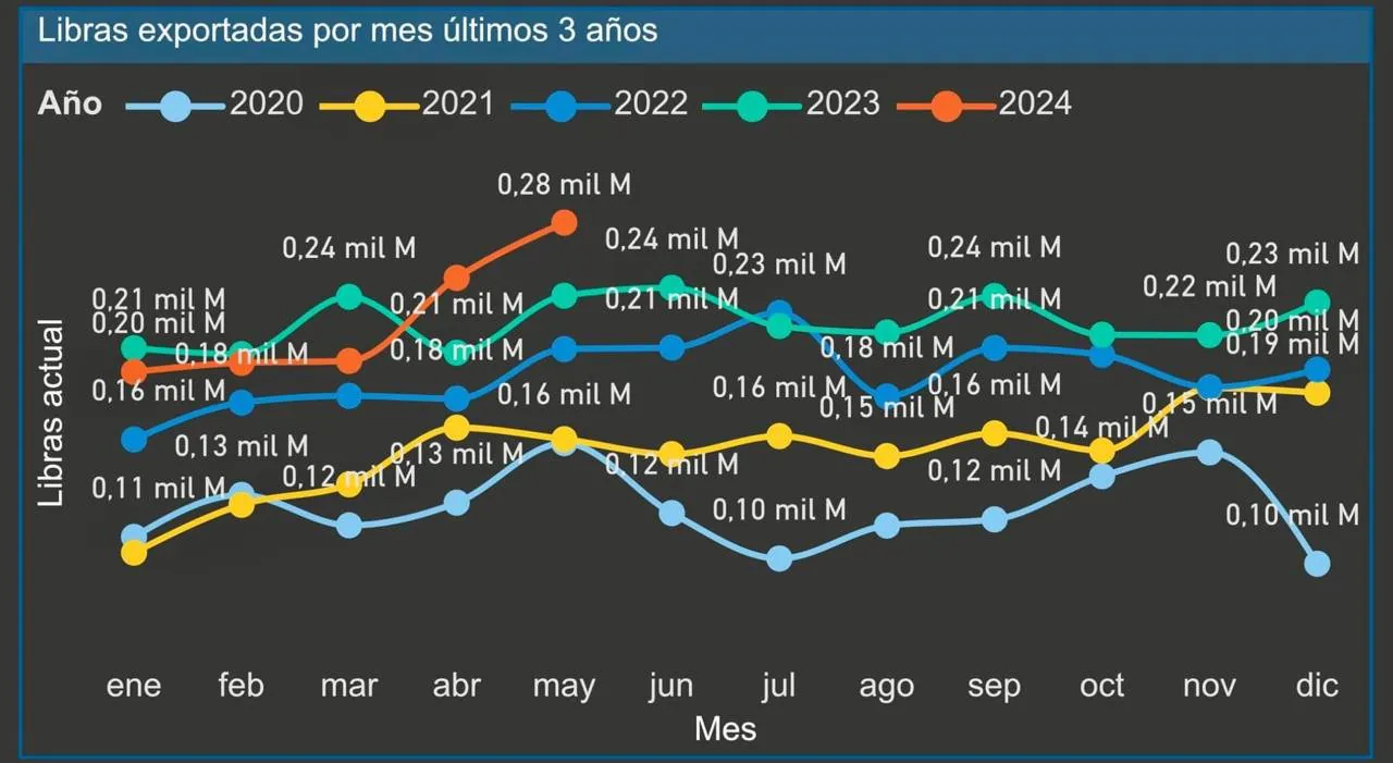 مقدار صادرات میگو از اکوادور در ماه می ۲۰۲۴ با افزایش ۱۶ درصدی نسبت به ماه می سال قبل به ۲۷۵.۳ میلیون پوند (۱۲۵.۱۵۸ تن) به ارزش ۶۰۲.۲ میلیون دلار آمریکا رسید که با افزایش ۵ درصدی ارزش همراه بود. متوسط قیمت فروش میگوی اکوادور ۲.۱۹ دلار آمریکا در هر پوند معادل۴.۸۲ دلار در هر کیلوگرم بوده است.