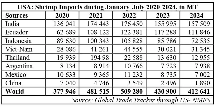 در نیمه اول سال ۲۰۲۴، هند با سهم ۳۷ درصدی از کل واردات، بزرگترین تامین کننده میگو در بازار ایالات متحده بود و بیش از ۵۰ درصد میگوهای رد شده توسط FDA به دلیل آنتی بیوتیک های ممنوعه مربوط به این کشور بود (به SSA مراجعه کنید. صفحه وب تامین کنندگان خود را بررسی کنید: پایگاه داده میگوهای آلوده به آنتی بیوتیک و میگوهای تولید شده با کار اجباری).