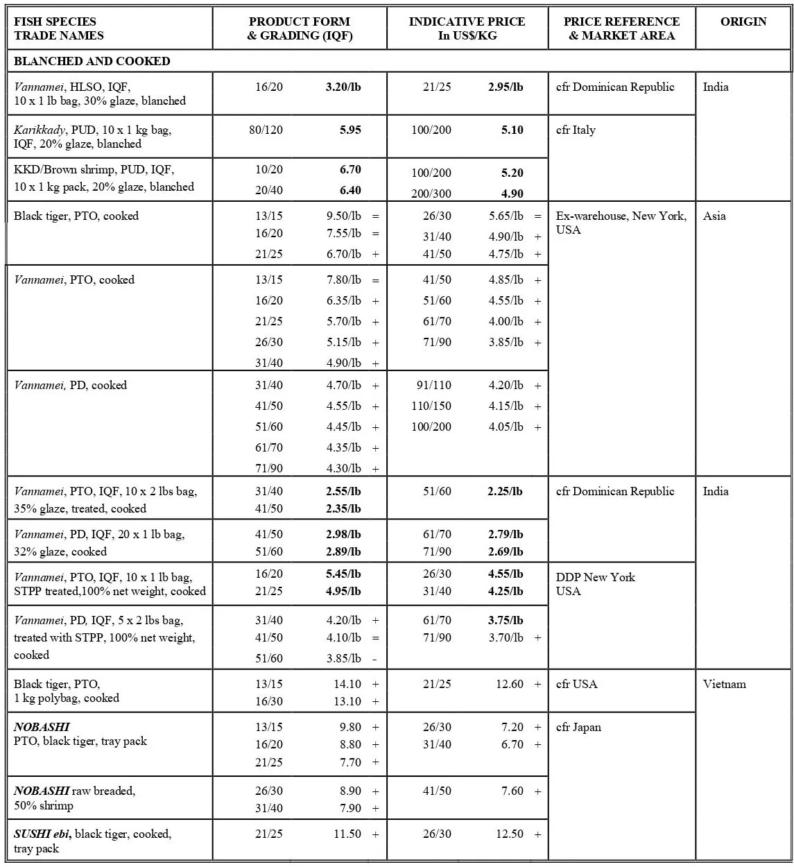 - قیمت سر استخر میگوهای پرورشی شروع به افزایش کرده است در حالی که تولید جهانی کمتر از سطح سال گذشته است. با وجود قیمت های پایین در تجارت بین المللی، کمبود واردات در اکثر بازارها از جمله چین ادامه داشت. افزایش روند تقاضا در طول یک هفته جشن روز ملی در چین پیش بینی می شود.