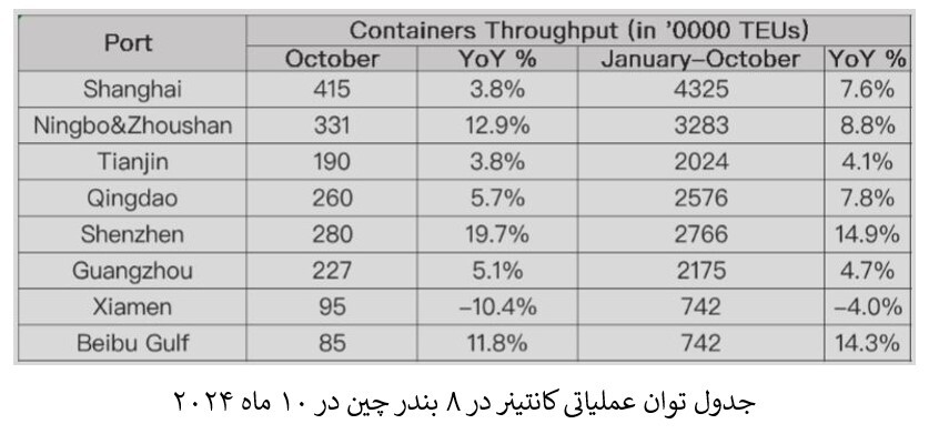 - رشد مثبت: طی ده ماه سال جاری میلادی، از بین هشت بندر چینی، تنها یک بندر با کاهش جابهجایی کانتینر مواجه شد و سایر بنادر رشد قوی و مثبتی را تجربه کردند.